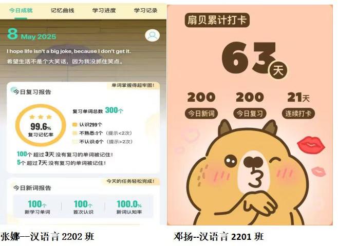此次“疯狂21天”单词打卡活动,是文新学院学风建设的一次成功实践,为同学们搭建了挑战自我、积累知识、实现成长的优质平台。同学们凭借坚持收获进步,依靠自律实现蜕变,不断突破自我,为学院的学风建设注入了强劲动力。让我们为每一位坚持打卡的同学点赞,期待他们在未来的学习中取得更优异的成绩!