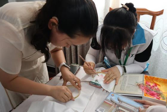 在覃曼丽的工作室内,实践团成员系统学习了湘绣基础技法。覃曼丽提前备齐绣布、丝线等材料,从掺针、套针等经典针法切入,示范劈线要领,并手把手纠正学员运针角度与力度。团队成员在描摹图案轮廓时,覃曼丽强调“线条需流畅如行云”,并穿插讲解“一长一短”的运针规律。过程中,她展示了一根丝线拆解为百根细线的绝技,其精细程度令学员惊叹。