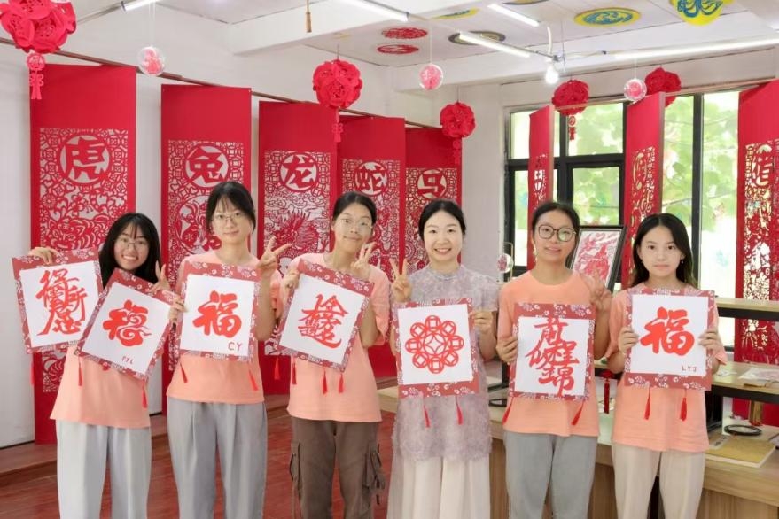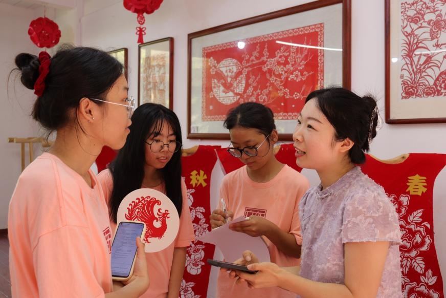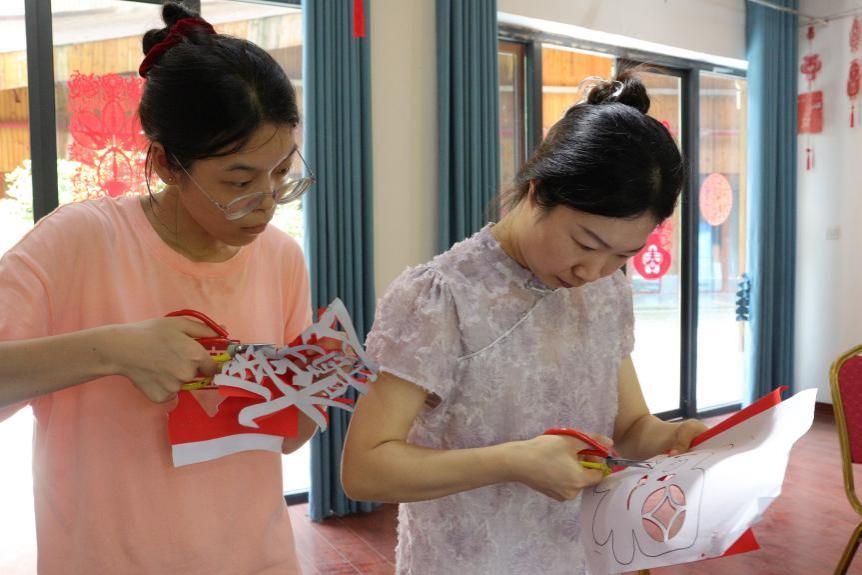 在非遗剪纸体验环节,朱露耐心示范每一个步骤,“来,这里需要对折起来,先把里面的阴影剪掉,再剪去外面的多余部分,不能搞反了哦!”团队成员们屏息凝神,认真观看和学习每一处剪纸细节,按图案轮廓精心裁剪。剪刀在红纸上游走、红纸在手里翻飞,一个个独特的剪影慢慢清晰起来。虽然剪法略显生涩、粗糙,但这一过程使成员们深切感受到了非遗文化的独特魅力。