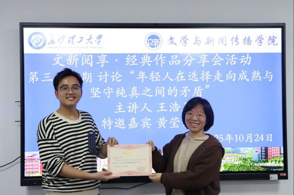 10月24日晚,文新学院第三十三期“文新阅享•经典作品分享会”在金盆岭校区九教223团体成长辅导室顺利举行。本期活动由汉语言2303班王浩辰担任主讲,以“年轻人在选择走向成熟与坚守纯真之间的矛盾”为题,细致解读了美国作家杰罗姆·大卫·赛林格的《麦田里的守望者》。中文系黄莹副教授作为特邀嘉宾出席活动。