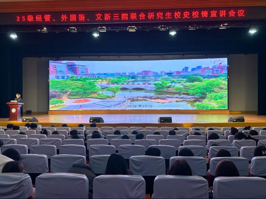为帮助2025级研究生新生深入了解学校发展历程,增强对学校的认同感和归属感,11月4日晚上,文学与新闻传播学院、经济与管理学院、外国语学院于金盆岭校区五教大礼堂联合举办校史校情专题讲座。全体研究生新生参加本次活动,讲座由XK星空研究生宣讲团成员主讲。