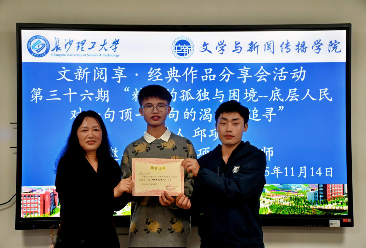 11月14日晚19:30,文新学院第三十六期“文新阅享·经典作品分享会”在金盆岭校区九教223团体成长辅导室顺利举办。本期活动由新媒体2401班邱项同学主讲,以“精神的孤独与困境——底层人民对一句顶一万句的渴望与追求”为主题,介绍了刘震云在2011年荣获茅盾文学奖的作品《一句顶一万句》。中文系黄宇老师以及24级辅导员项永生老师作为本次分享会的特邀嘉宾参与活动。