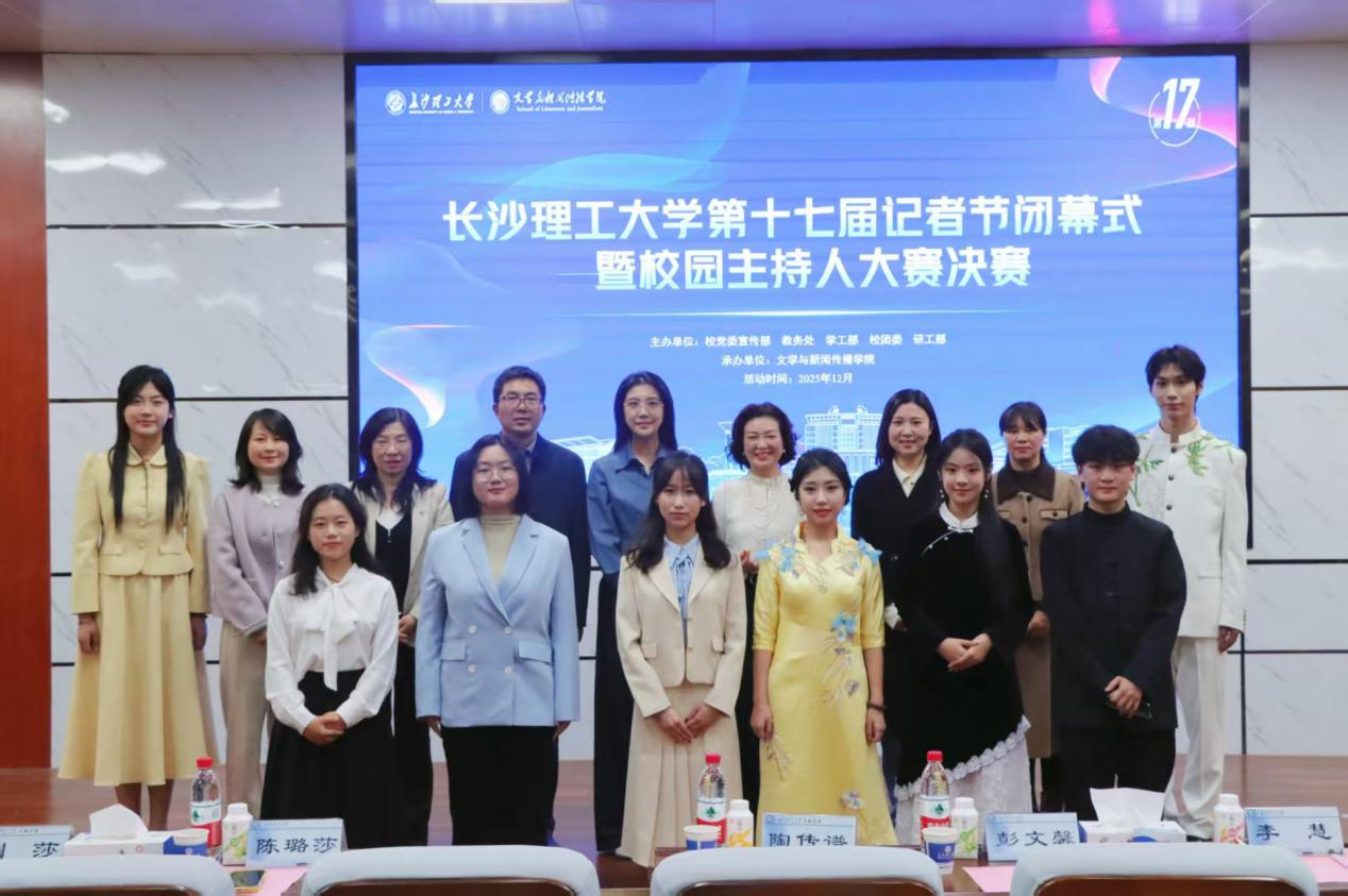 2025年12月19日19:00,由校党委宣传部、教务处、学工部、校团委、研工部主办,文学与新闻传播学院承办的XK星空第十七届记者节闭幕式暨校园主持人大赛决赛在金盆岭校区四号教学楼108学术报告厅举行。山东广播电视台主持人彭文馨,湖南省朗诵艺术协会支部书记、全国“读书成才女职工”获得者李慧,校团委副书记(主持工作)陈璐莎,校学生工作部副部长陶传谱,校图书馆副研究馆员、国家汉办语合中心国际汉语教师、湖南省语委普通话测试员张雪梅,文新学院新闻系副教授、湖南省高校教学能手曾志华,文新学院党委副书记刘莎出席本次活动并担任评委。