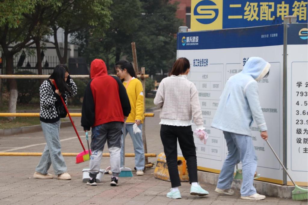 此次卫生区域打扫,同学们分工明确,相互配合。同学们有的在公共草坪区域进行清洁工作,如捡塑料垃圾、碎纸屑等;也有同学在大门前坪进行卫生打扫,如清理落叶、清扫烟头、捡拾外卖包装、检查墙上是否粘贴“牛皮癣”等;还有同学将停放在门口和马路上的电动车、自行车摆放得更加整齐有序并劝导学生规范停电动车。