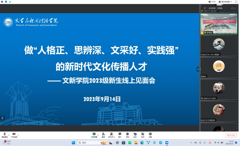 9月14日下午2点,文新学院在金盆岭校区9教223团体辅导室举行2023级新生线上见面会,院党委副书记刘莎出席,学工办全体辅导员及2023级全体新生参加。