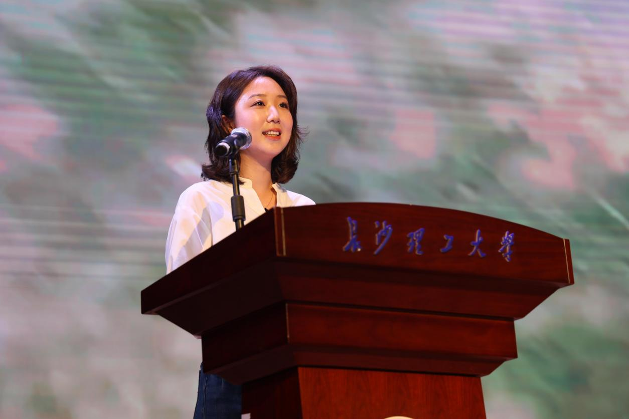 校友代表原新媒体2101班团支书李祉陈登台演讲。她首先回顾了本科期间所在班级的有效创新建设经验,而后提及身处各行各业、为社会做出贡献的优秀文新学子们,以实例展现了文新人的凝聚力与创造力,并以此勉励新生们找准方向、勤学笃行,绽放属于自己的光彩。