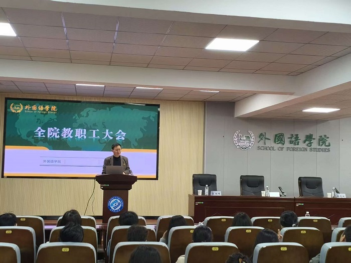 段胜峰指出,科研既是学院发展的核心指标,也是教师个人发展的核心竞争力,全院教师要把握好各类项目的申报时间,积极申报,争取产出高质量成果。学院将落实“应报尽报”相关保障措施,并积极做好申报服务工作。人才培养是学院的中心工作,当前学院正在着手修订2025版本科人才培养方案,要以增强学生社会适配度、提高人才培养质量、凸显复合型外语人才特色为目标,充分调研论证,调整优化一批课程,求真务实抓好修订工作。面对专业和课程调整,全体教师一方面要认真备课,自觉提高课堂教学质量;同时也要自我加压,主动思考转型发展,加强自学充电,以适应新的培养方案和新课程的要求。