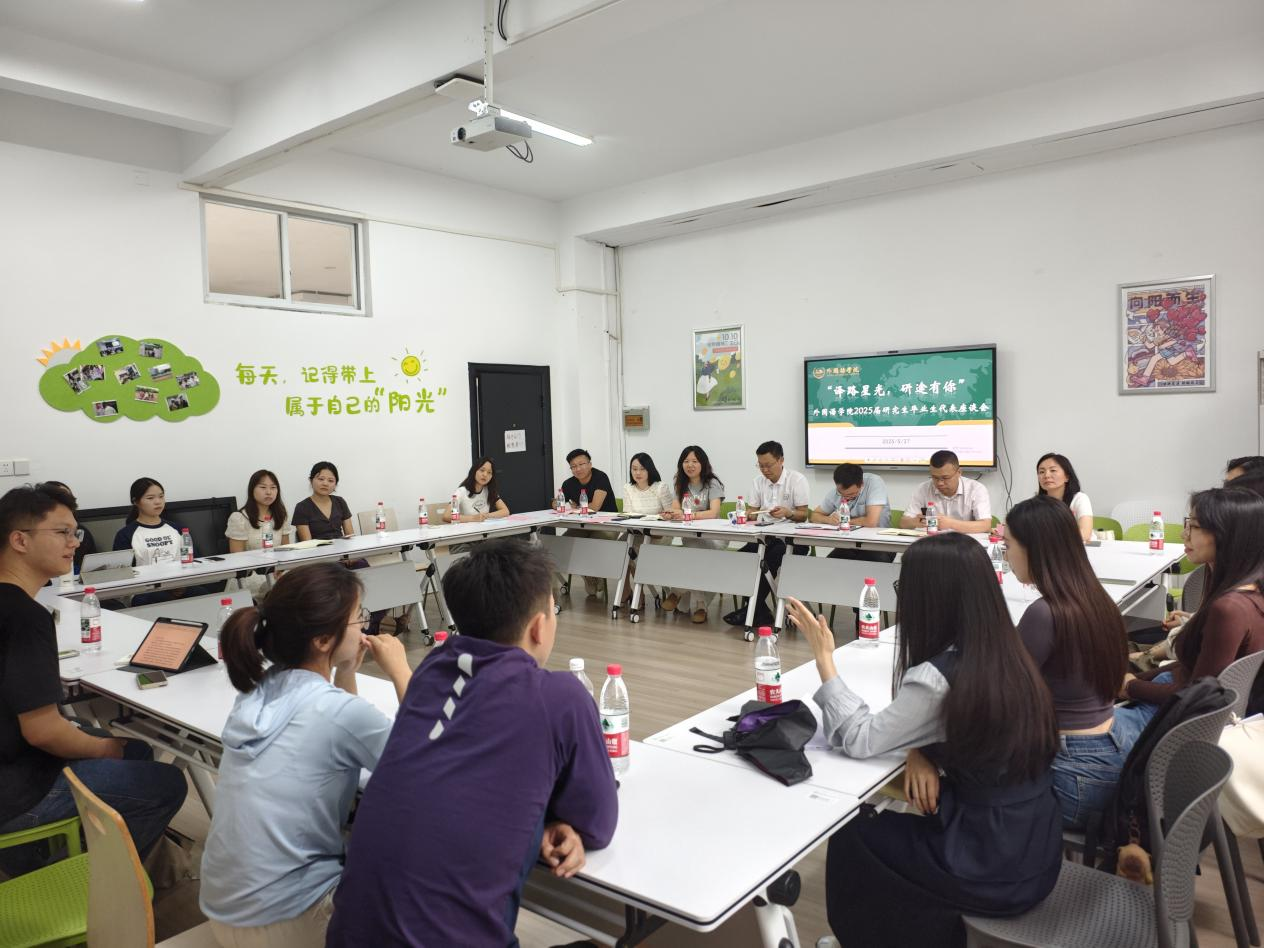 为进一步了解研究生毕业生思想动态,优化人才培养和就业指导工作,5月27日下午,外国语学院于金盆岭校区3号教学楼220室召开2025届研究生毕业生代表座谈会。学院党委书记陈仁凯、院长段胜峰、党委副书记周芳、副院长姚尧、导师代表张志武、李颖、辅导员郭恒、毕业生代表16人共同参加座谈。