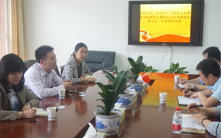 4月11日下午,广西师范大学国际文化教育学院副院长兼国际交流处副处长郭元兵一行来我院调研,学习借鉴我院在承办孔子学院、奖学金学生管理和对外招收海外学生等方面的成功经验。