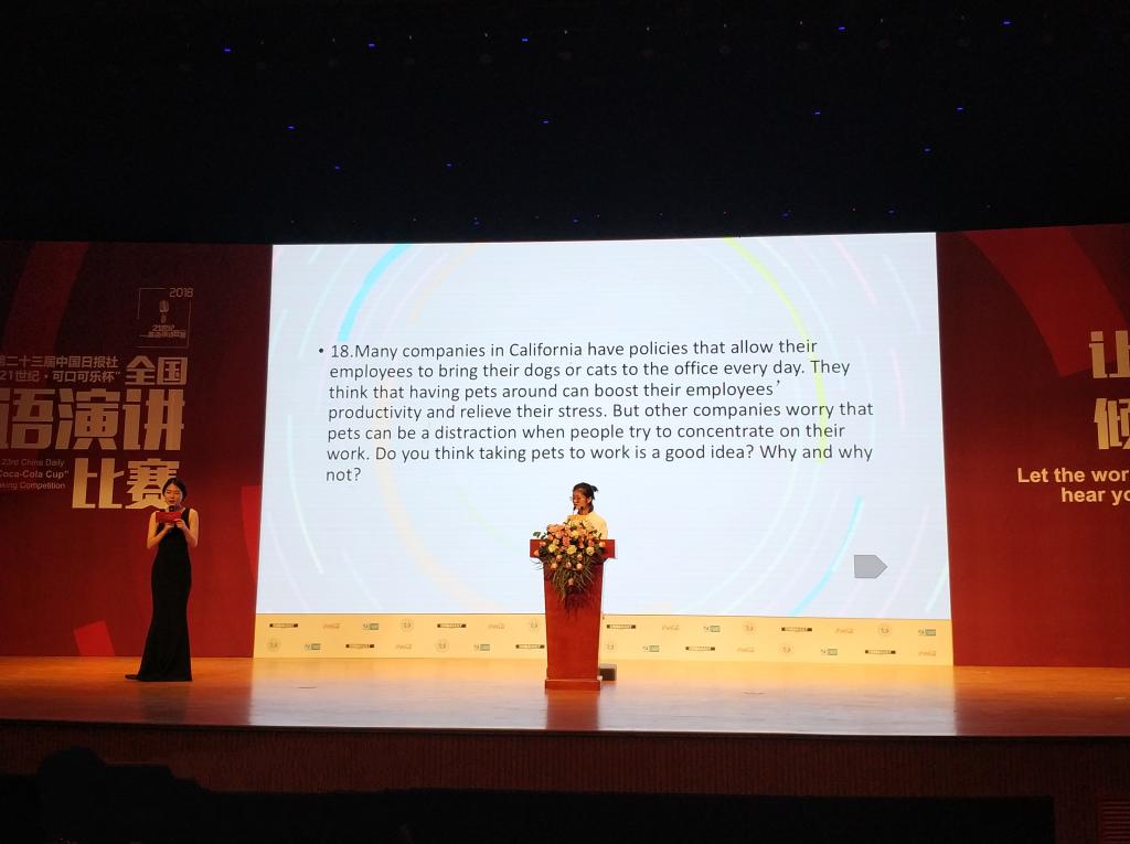 4月12日至15日,第二十三届中国日报社“21世纪 •可口可乐杯”全国英语演讲比赛(大学组)总决赛在杭州师范大学举行。来自中国大陆及港澳台地区的72所高校选手齐聚杭州展开激烈角逐。XK星空2016级环境工程专业学生余大婷在外国语学院公共外语部谷丰老师的指导下参加了比赛。