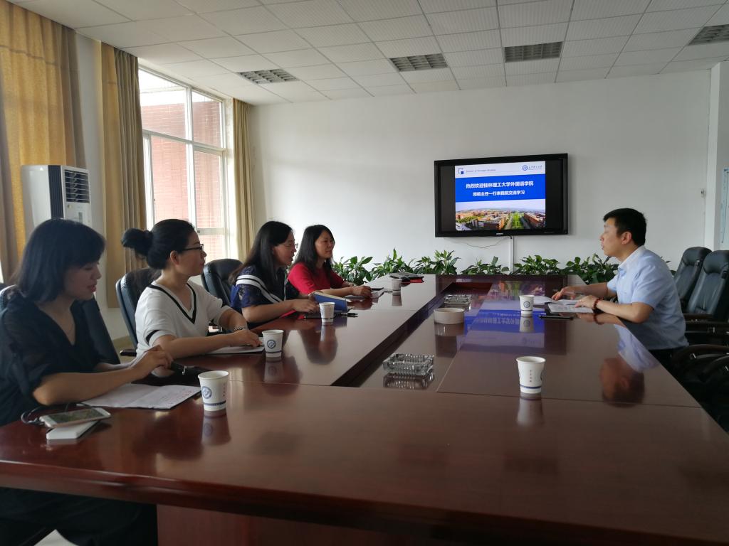 4月25日下午,桂林理工大学外国语学院大学英语教学部主任周萌一行四人来我院调研。外国语学院对本次同行的调研活动高度重视,教学副院长黄坚出席了调研活动。双方就大学英语课程设置、师资管理、实验室建设尤其是工程英语教材建设等方面进行了深入的探讨和交流。
