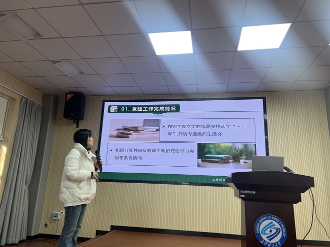 段胜峰院长做学院2024年度工作总结汇报,他从高质量党建引领高质量发展、树立先锋强团队、教育教学促成长、思政育人助就业、科研助力求突破、研究生管理创品牌等六个方面归纳总结,肯定了成绩,同时也指出了存在的不足。紧接着,段胜峰讲解学院2025重点工作计划,他从加强班子政治建设、推进专业教学改革、提升研究生培养质量、深入推进学院文化内涵建设、营造“双创”生态、加强教师职业生涯规划指导等方面进行阐述。