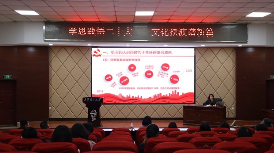 方琼紧密结合党的二十大报告原文,以中国现代化道路的探索为切入点,围绕“学习贯彻党的二十大精神”这条主线,从学习贯彻习近平总书记关于中国式现代化的重要论述、全面贯彻落实党的二十大精神、以中国式现代化引领学校内涵式高质量发展等三个方面展开论述。她表示习近平总书记在学习贯彻党的二十大精神研讨班开班式上发表重要讲话强调,“概括提出并深入阐述中国式现代化理论,是党的二十大一个重大理论创新,是科学社会主义的最新重大成果”。习近平总书记在人代会闭幕会上的重要讲话中强调“加快推进中国式现代化建设”,我们党的初心和使命,是为中国人民谋幸福、为中华民族谋复兴。中国共产党成立一百多年来所进行的一切奋斗,目的就是把我国建设成为社会主义现代化强国、实现中华民族伟大复兴。