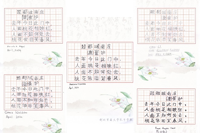 本年度国际中文日的主题为“中文:架起文明互鉴的桥梁”。在国际中文日来临之际,利大孔院举办以“春”为主题的书法比赛,用饱含春意的诗词让学生们感受汉字的魅力与春日的勃勃生机。