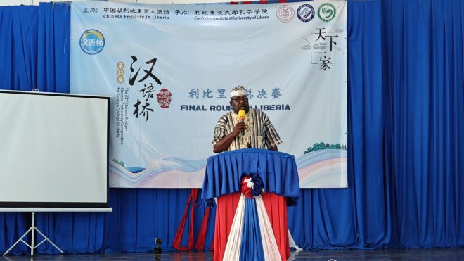 然后是利比里亚广播电台台长Faghon先生致辞。他对参赛学生们流利的汉语水平表示惊讶。他鼓励利比里亚青年不仅要学习汉语,更要学习中国的先进技术,为利比里亚的发展贡献力量。