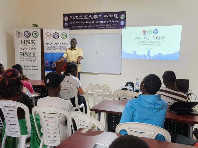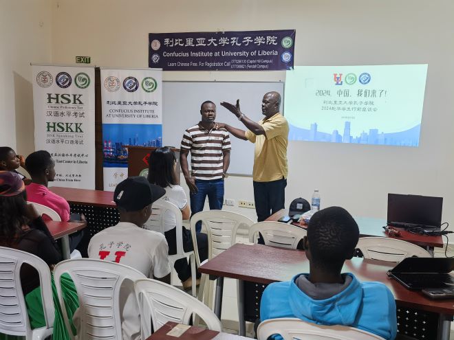 当地时间8月10日,利比里亚孔子学院为即将赴华的学生召开行前座谈会。利大孔院利方院长Dexter Sumo、中方院长周红专、孔院全体教师、“汉语桥”世界大学生中文比赛全球总决赛的参赛选手和观摩选手、六名国际中文教育奖学金获得者及孔院暑假HSK培训班的学生共60余人参加了本次会议。