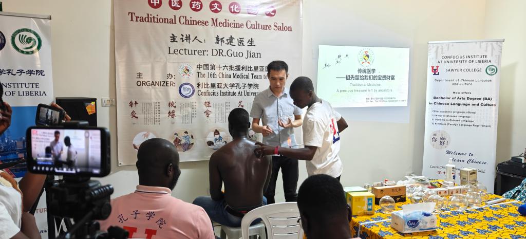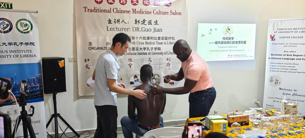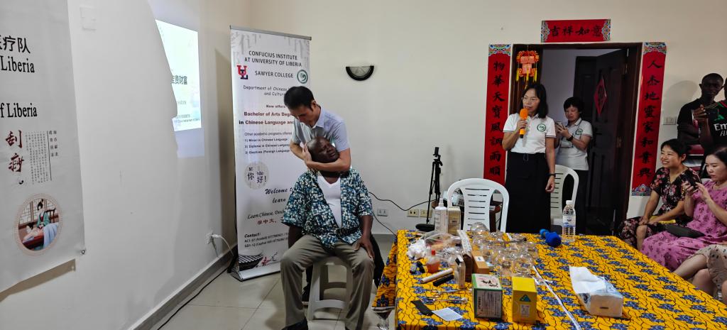 在热烈的掌声中,医疗队队长郭建医生走上讲台,以“传统医学——祖先留给我们的宝贵财富”为题,结合图片及视频、各种中成药及中医医疗器械实物展示等多重形式,生动地表现了中医药文化的历史底蕴、丰富内涵和伟大成就,并向观众们演示了针灸、艾灸、拔罐、刮痧、耳穴压豆、推拿、正骨等多种中医疗法,旨在以中医药传承与发展为案例,唤起利比里亚青年发掘、保护和传承利比里亚乃至非洲传统医学。