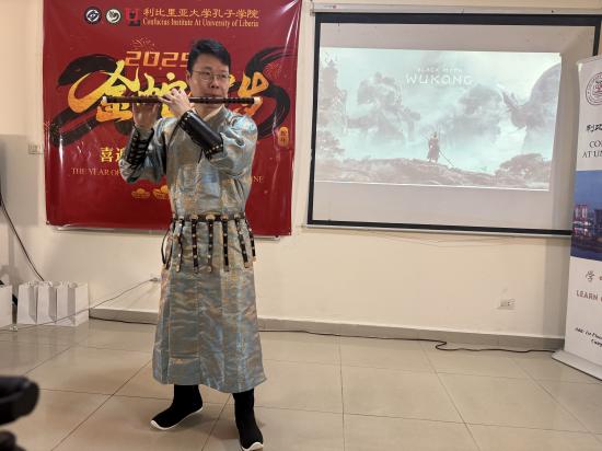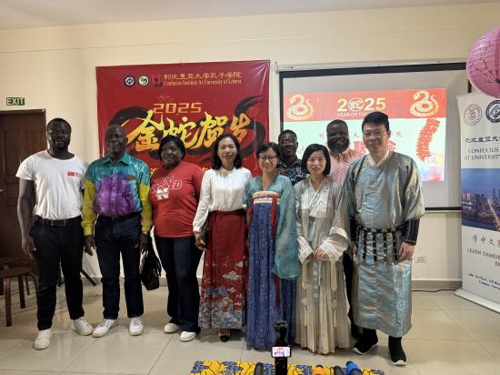 当地时间2025年1月25日,利比里亚大学孔子学院在中方教师驻地举办了一场热闹非凡的春节联欢会。此次联欢会吸引了援利医疗队、在利中资企业代表、孔院教学点负责人、众多师生、以及利国中文爱好者们的热情参与,近百人欢聚一堂,共庆2025中国农历新年的到来。利比里亚多家知名电视、广播及主流网络媒体对本次春节联欢会进行了全程直播及新闻报道。