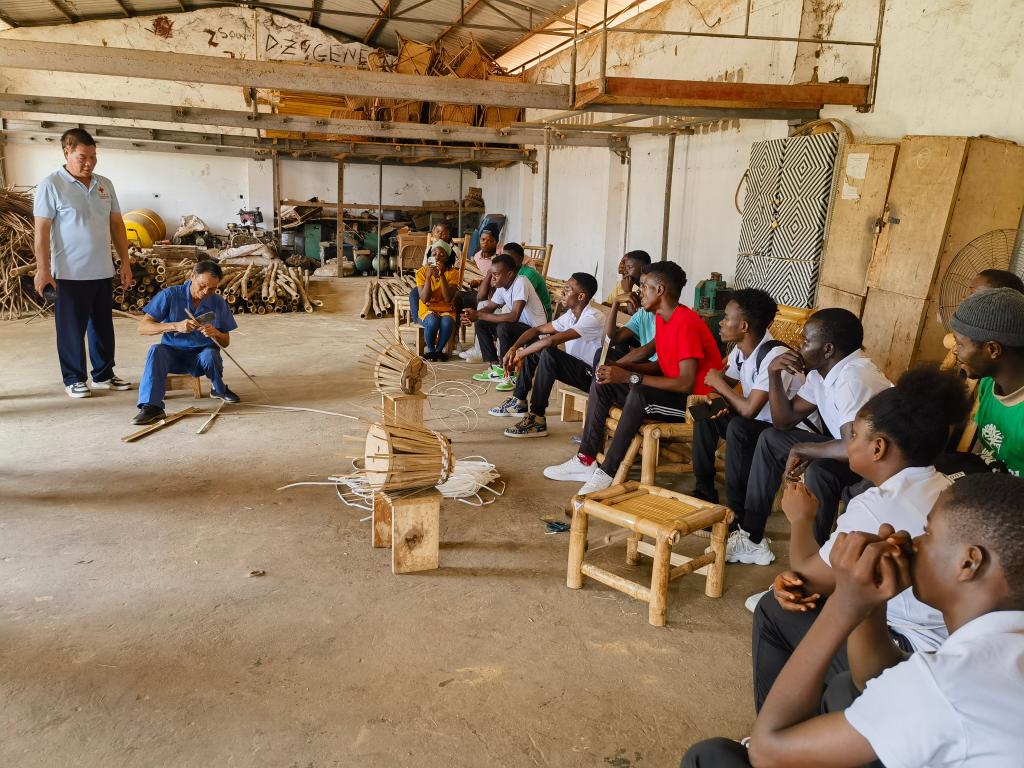 活动伊始,援利竹藤编项目组的专家向学生们介绍了中国竹藤编工艺的发展历程,并展示了竹藤编技艺的基本技巧。学生们不仅观看了现场制作过程,还在老师的指导下亲手体验了编织技巧,感受这一传统技艺的魅力。许多学生对竹藤编技术产生了浓厚的兴趣,甚至想立刻报名参加竹藤编技术培训班。