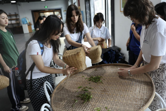 走进制茶工坊,大家将所采的茶叶平铺开来。萎凋、揉捻、发酵、干燥等传统工序依次展开。在手工揉捻体验环节,营员们在专人指导下感受茶叶在掌心的变化,体悟茶匠精神。在采访时其中一位营员表示,“我之前听说过中国茶文化的源远流长和博大精深,但是今天在经历了从摘茶叶到制茶这一过程,我更加深刻体会到中国茶文化的深厚底蕴,也更加热爱中华文化。”
