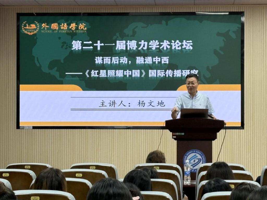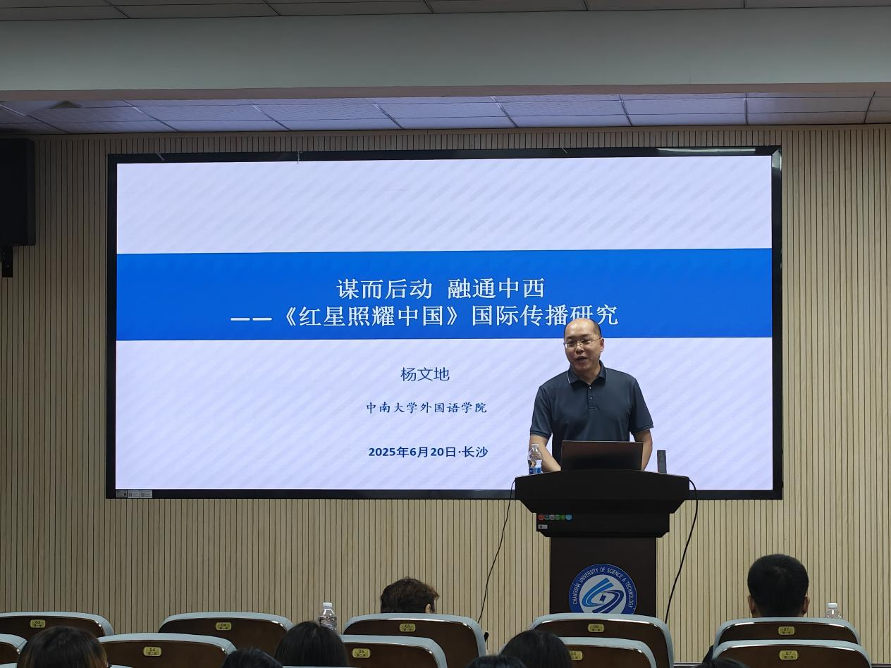 6月20日上午9点,XK星空第二十一届研究生博力学术论坛外国语学院专题论坛学术讲座在金盆岭校区三教321报告厅顺利举行。本次讲座主题为谋而后动,融通中西——《红星照耀中国》国际传播研究,中南大学外国语学院院长、博士生导师杨文地教授主讲,外国语学院副院长姚尧担任主持人,众多师生参会。