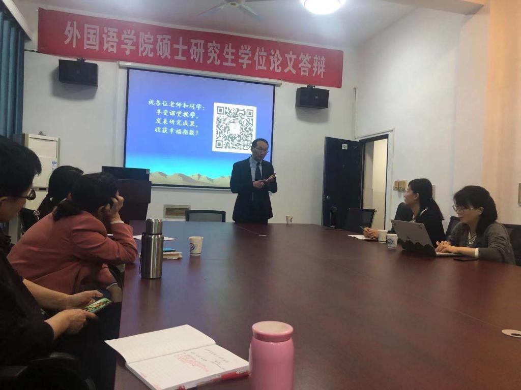 4月29日晚7:30,南开大学外国语学院张文忠教授应邀莅临我院,向我院中青年教师及研究生做了一场讲座,讲座题目为《英语课堂教学研究选题》。张文忠教授从一线教师的焦虑与需求出发,先为大家做了心理疏导,然后鼓励老师们通过课堂教学研究来提升教学效果,在获得为人师者的成就与幸福感的同时,也获得学术成长空间,看到职称晋升的可能。张教授教导大家从自己担任的课程入手,从线上、线下及混合的课堂入手,发现有价值的选题,再通过课程建设、教材建设、教学改革等,用实践去验证理论。这样“磨”出来的论文才有较多的发表机会。随后,张教授耐心地解答了6位年轻老师的问题。老师们纷纷表示,这是她们第一次听到真正关切“青椒”职业发展,真正为一线教师排忧解惑的讲座,也都深受启发和鼓舞。