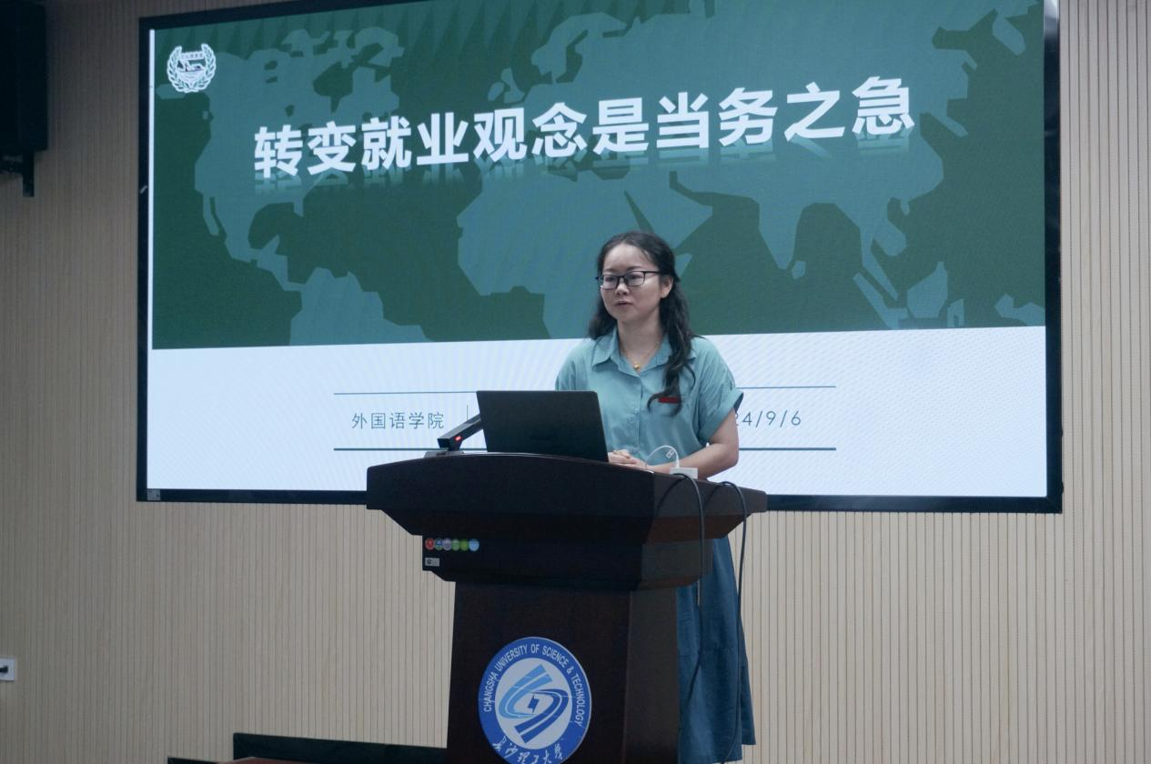 为全面贯彻落实党中央、国务院关于高校毕业生就业工作的决策部署,推动毕业生高质量就业,外国语学院于2024年9月6日(周五)下午19:00召开2025届毕业生就业动员大会暨家校沟通会,指导帮助2025届外语学子了解就业形势,以更加积极的态度、更加扎实的技能、更加坚韧的意志,去迎接未来的挑战。学院党委书记文丽丽、院长段胜峰、党委副书记周芳出席本次大会,会议由就业专干武巧琳主持。全体 2025 届本科和研究生毕业生在三教321报告厅参加会议,毕业生家长通过线上腾讯会议收看现场直播。