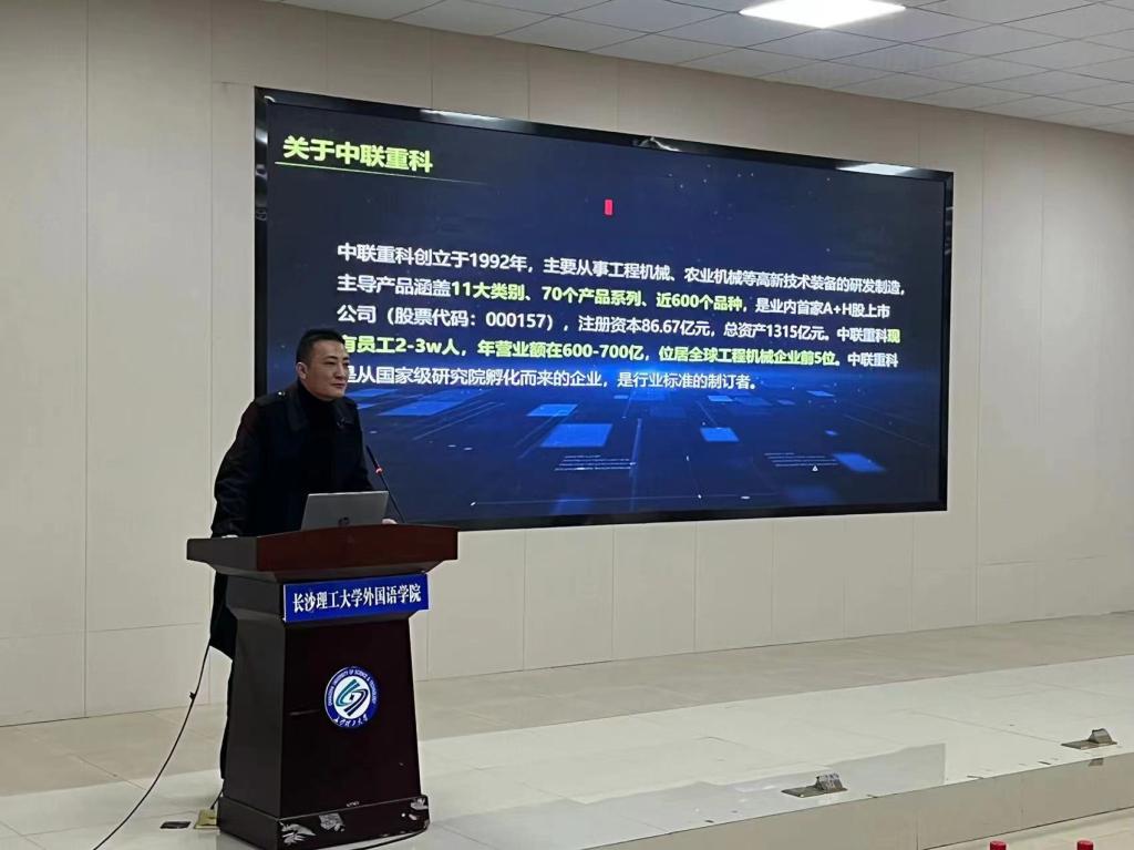 事业部海外营销总监李觅向大家详细介绍了中联重科公司的基本情况和良好行业前景,并介绍了主要招聘的岗位类型、各岗位职责及任职条件,鼓励同学们开拓自己的就业视野,到祖国建设发展需要的地方去,做一个对国家和社会有贡献的青年人。