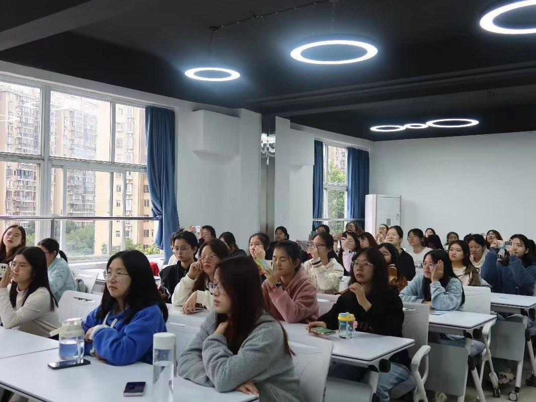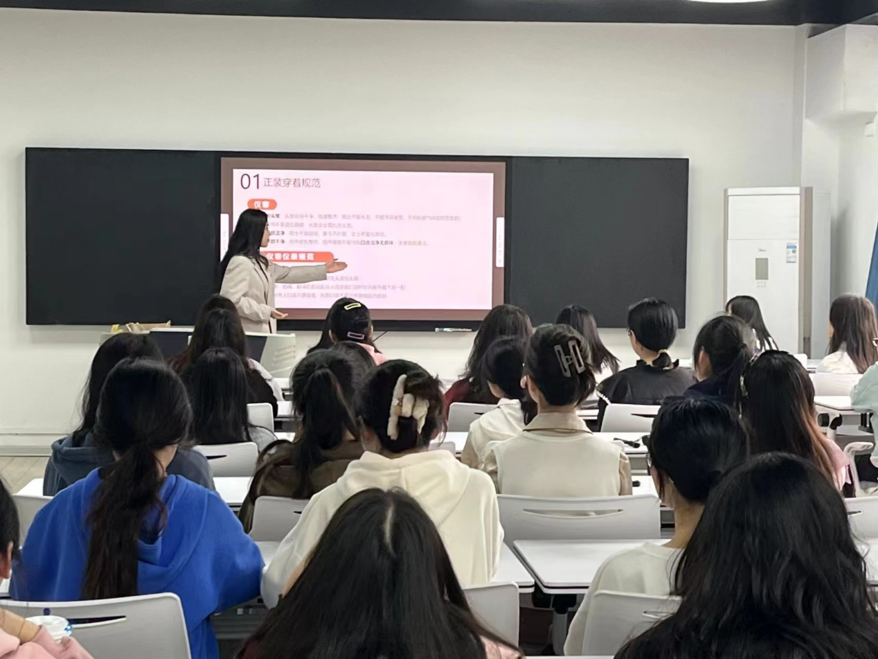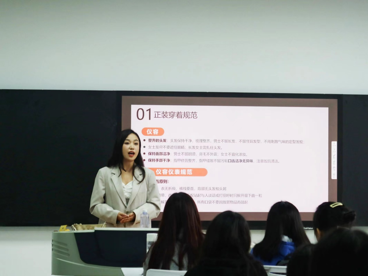 樊明焱老师从穿衣规范、量化穿衣、穿搭法则三大方面开展培训,就“如何摆脱学生气”这一问题入手,深入到穿衣的风格、色彩、明度以及设计。讲解之后,樊明焱老师结合实例,以图片的形式生动地向同学们展示不同穿搭的实际运用,让大家的体会更加深刻。讲课过程中,同学们可以随时提出疑问,樊老师由理论联系实际,化抽象概念为具体实践,让大家充分感悟领会。现场气氛活跃,同学们的反响热烈。
