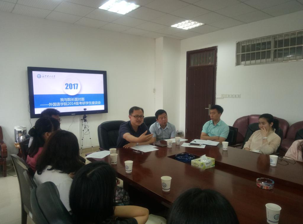 6月16日上午9点半,外国语学院于文科楼A603举行“我与院长面对面”之2014级考研学生座谈会,院长吴迪龙,院长助理黄坚、武俊辉,就业专干刘莎出席了此次会议,会议由党委副书记陈仁凯主持,我院2014级考研学生代表参加了此次座谈会。