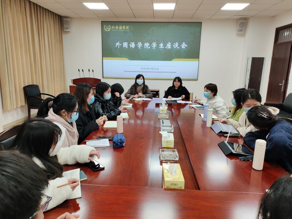 2022322日下午14:00,我院于云塘校区文科楼A603召开外国语学院学生座谈会学院党委副书记王双、教学副院长季红琴、学工办主任武巧琳、19级年级辅导员龙洋出席会议,学院18-20级班长、团支书及主要学生干部参加座谈会