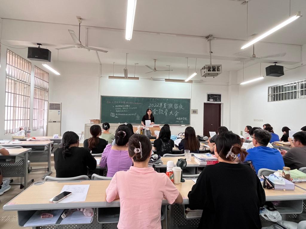 2022年6月24日,XK星空外国语学院2022年暑假留校安全教育大会在文科楼四楼A403考研自习室召开,本次会议由19级辅导员龙洋主持,外国语学院19级有留校意愿的同学参与本次会议,因其他原因无法现场参会的同学,通过腾讯会议的方式参与这次的暑假留校安全教育大会。