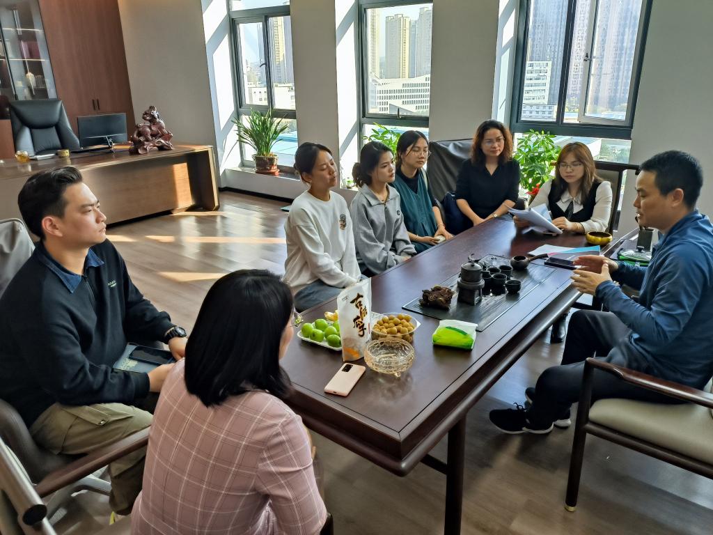 为开拓就业市场、全面深化校企合作及供需对接,将学生毕业实习与就业相结合,外国语学院党委副书记周芳、副院长季红琴、负责实习工作的谭莲香、就业辅导员龙洋、研究生辅导员陈若晨于10月25日下午带领学生参观走访湖南蒂菲森环保科技有限公司TikTok Shop认证跨境TSP平台,商讨校企合作模式。