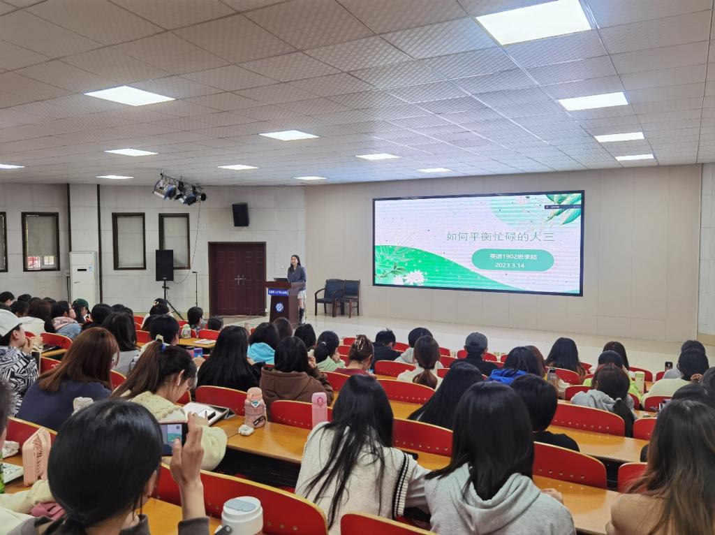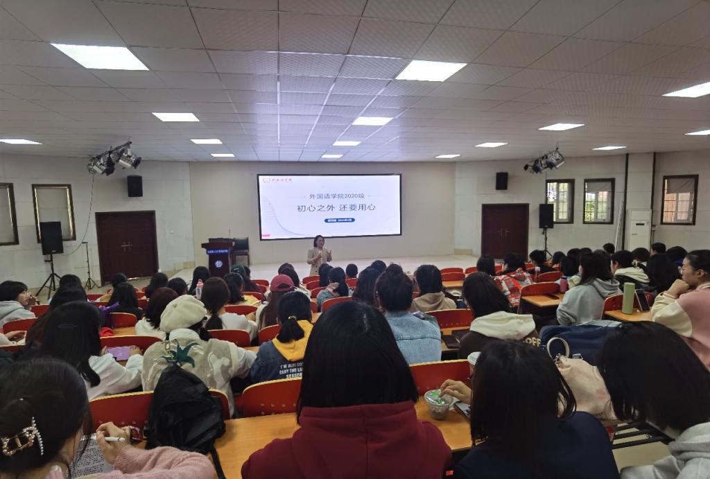 3月14日下午,为加强学生发展指导,明确学生发展方向,我院在文科楼A100圆厅面向2020级全体本科生召开主题为“初心之外,还要用心”的年级大会。本次大会在年级辅导员武巧琳老师的主持下有序进行,学院党委副书记周芳、副院长季红琴莅临现场为学生答疑解惑。此次会议还邀请了英语1901班陈昭涵及英语1902班李超两位同学就考研历程、平衡生活、调整心态等方面进行经验分享与交流,令人受益匪浅。