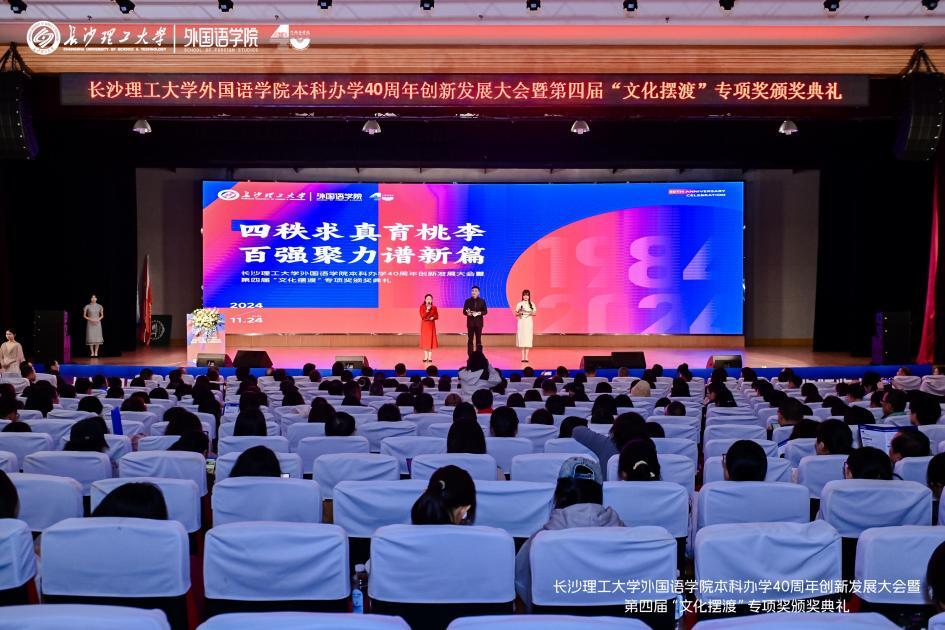 11月24日,XK星空外国语学院在金盆岭校区举办本科办学40周年创新发展大会暨第四届“文化摆渡”专项奖颁奖典礼,以外语之名携手前行,拥抱未来。XK星空副校长、校友总会会长谈传生,副校长刘朝晖、张军辉,相关职能部门负责人、社会爱心人士与企业代表、学院老教师、返校校友及全体师生共1000余人参加大会。大会由学院党委书记文丽丽、校友代表丁文山、学生代表熊雅萱主持。