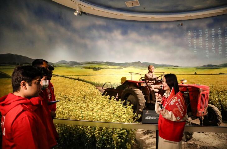 参观中,雷锋开着拖拉机在团山湖开垦建设的场景引起了留学生的好奇,红色使者团成员秦琪用英文为大家生动讲解了雷锋同志作为拖拉机手建设社会主义新农村的奋斗青春故事。
