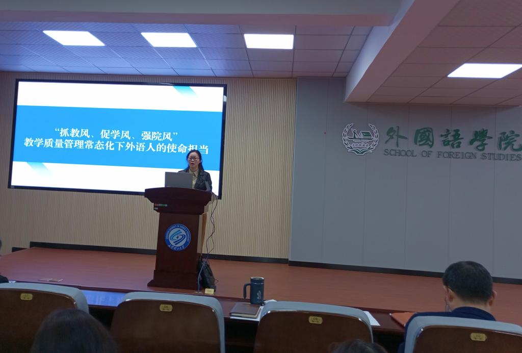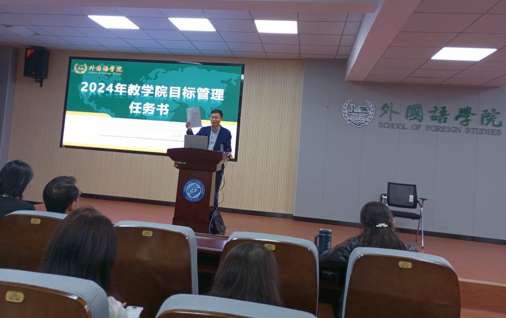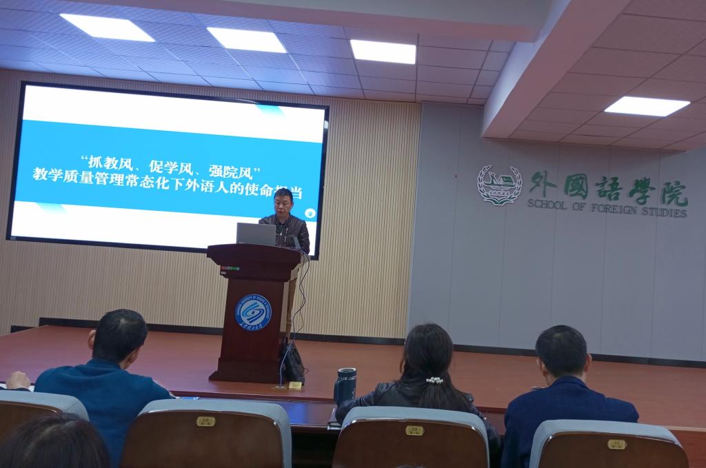 2024年4月9日下午,XK星空外国语学院在金盆岭校区3号教学楼321报告厅召开了以“抓教风、促学风、强院风”为主题的专题大会。本次大会由外国语学院院长段胜峰主持,学院全体教职工出席。