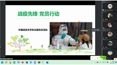 最后,在“战疫先锋,党员行动”主题党日活动环节,姚尧书记向全体教师展现了支部党员先锋队的战疫风采。疫情防控关键时期,在学院领导的高度重视和领导下,本支部党员同志争当先锋、勇作表率,穿上防护服献身于疫情防控工作,充分展现了党员先锋队的精神风采,以实际行动向全校师生展示疫情当下党员教师的思政情怀。(文/罗娟 图/谭莲香 审/季红琴)