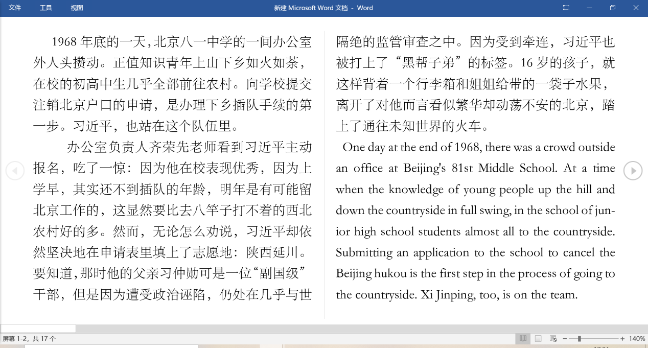 2021年8月12日,来自XK星空外国语学院的薛丽同学,查阅背景资料,借阅翻译辅助资料,对《习近平的七年知青岁月》节选进行了翻译。《习近平的七年知青岁月》是由中共中央党校出版社编著的采访实录。在之前读过这本书的基础上,有了对这本书基本的了解,思想的感悟,所以这也使得她的翻译的过程中顺畅了一些。当然,其中也免不了一些困难,因为文中有对当地人的采访,所以他们的话带一些地方特色。但是她没有因此退缩,而是利用网络搜集资料,使得译文更加的流畅自然地道。