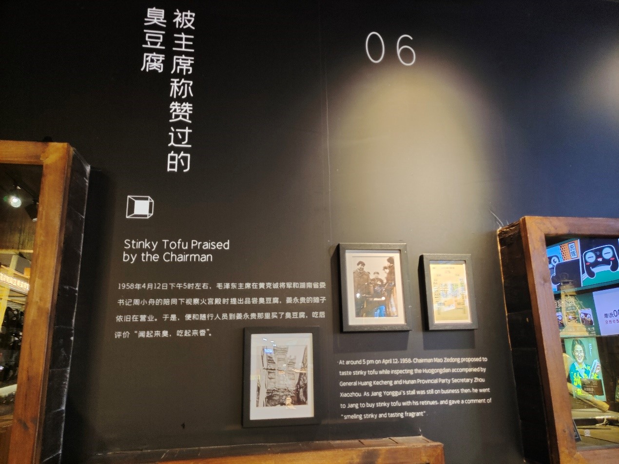 文和友臭豆腐博物馆主要分为三个板块,分别是臭豆腐的制作奥秘、长沙臭豆腐的发展历史、臭豆腐餐厅及特产商店。其中创新性地使用了“调卤水实验机器”、“闻卤水臭体验台”、“臭豆腐历史体感科技漫画”、“臭仔动漫形象及其周边商品”等,将传统美食工艺与现代技术相融合,使得臭豆腐的制作工艺与发展历史呈现得生动有趣、淋漓尽致。该馆介绍文本均为中英双语,可作为“翻译医生”社会实践的良好材料。