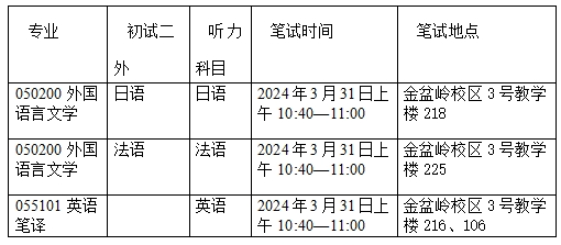 听力考试:考试时间定在3月31日上午10:40时开始。地点为XK星空金盆岭校区3号教学楼216教室(英语1考场)、 218教室(日语)、 106教室(英语2考场)、225教室(日语)。满分为10分。外国语言学及应用语言学和英语语言文学专业考生听力为二外(日语或法语)。考试时长为20分钟;翻译硕士专业学位考生听力为英语,考试时长为20分钟。