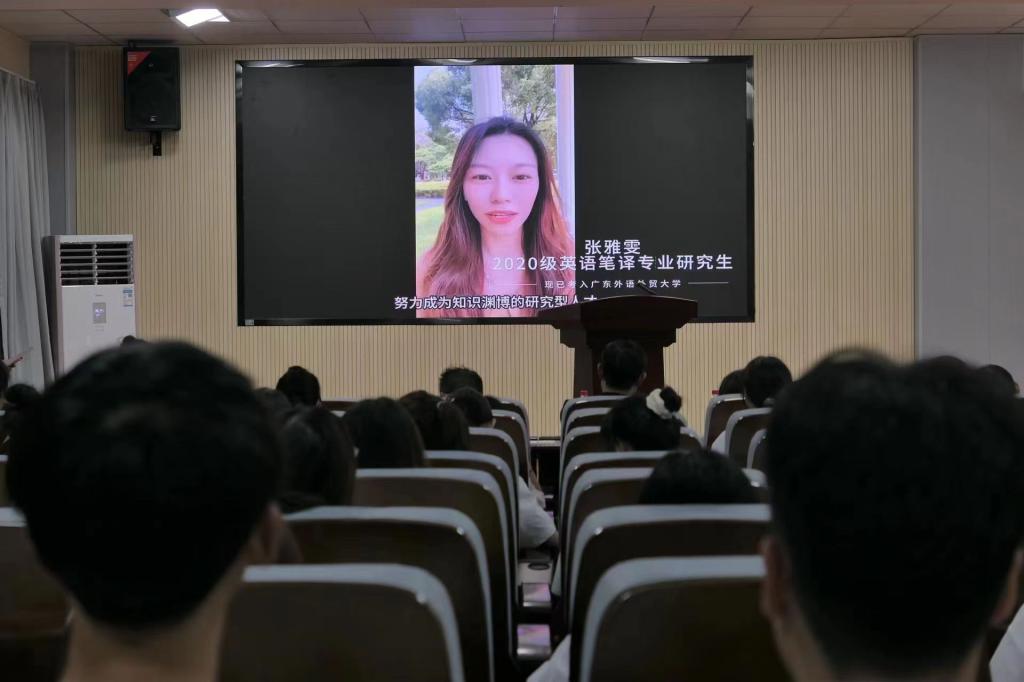 新生代表蔡文远则以“积极成为一名光荣的文化摆渡者”与同学们共勉,希望在读研之旅上,能以积极主动、无惧困难的姿态勇攀知识的高峰,不断增强语言交流能力、文化理解能力和国际传播能力,助推中华文化“走出去”。