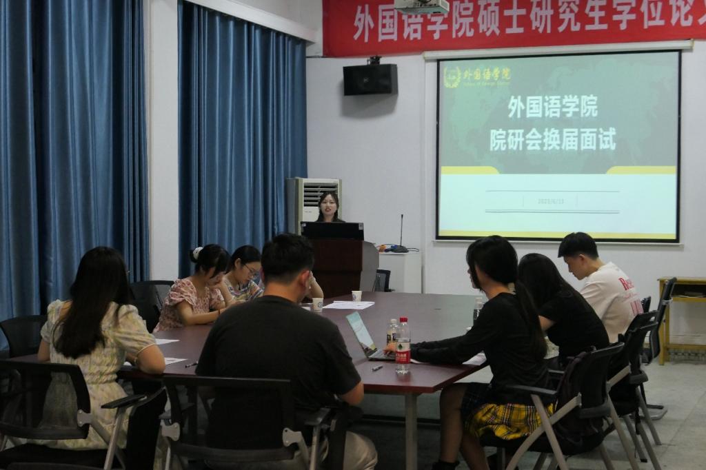 6月11日19:00,外国语学院研究生会年度工作述职大会于九教406举行。学院研究生辅导员陈若晨及22级院研会全体成员参加了此次会议。22级院研会各部门主要负责人就过去一年的工作进行了陈述总结,陈若晨对22级研会的工作给予了高度肯定,并对22级院研会成员在学生工作中付出的努力和贡献表达了感谢。