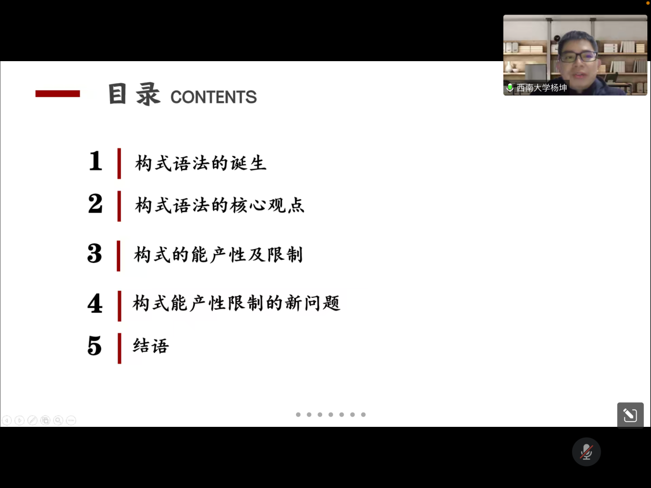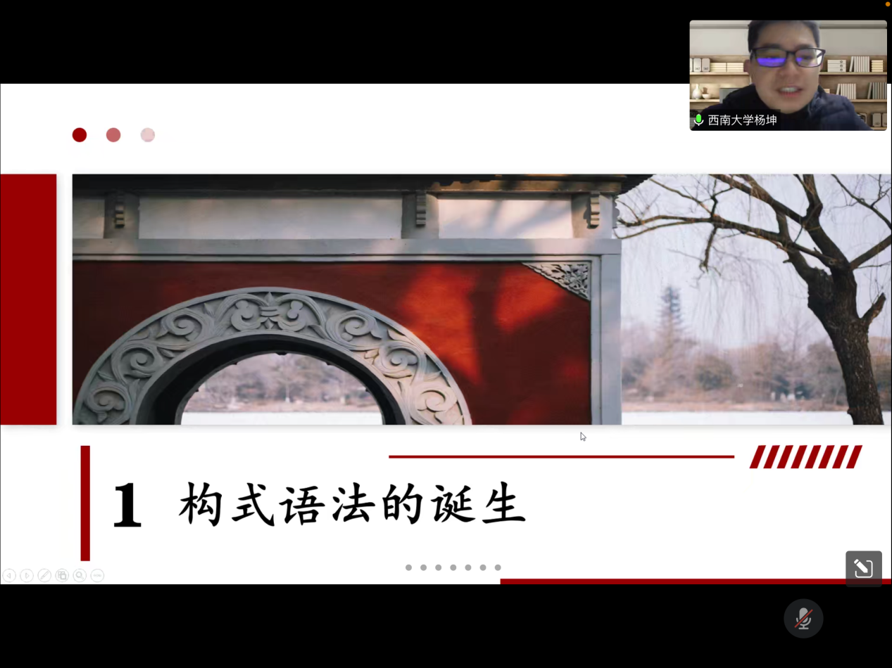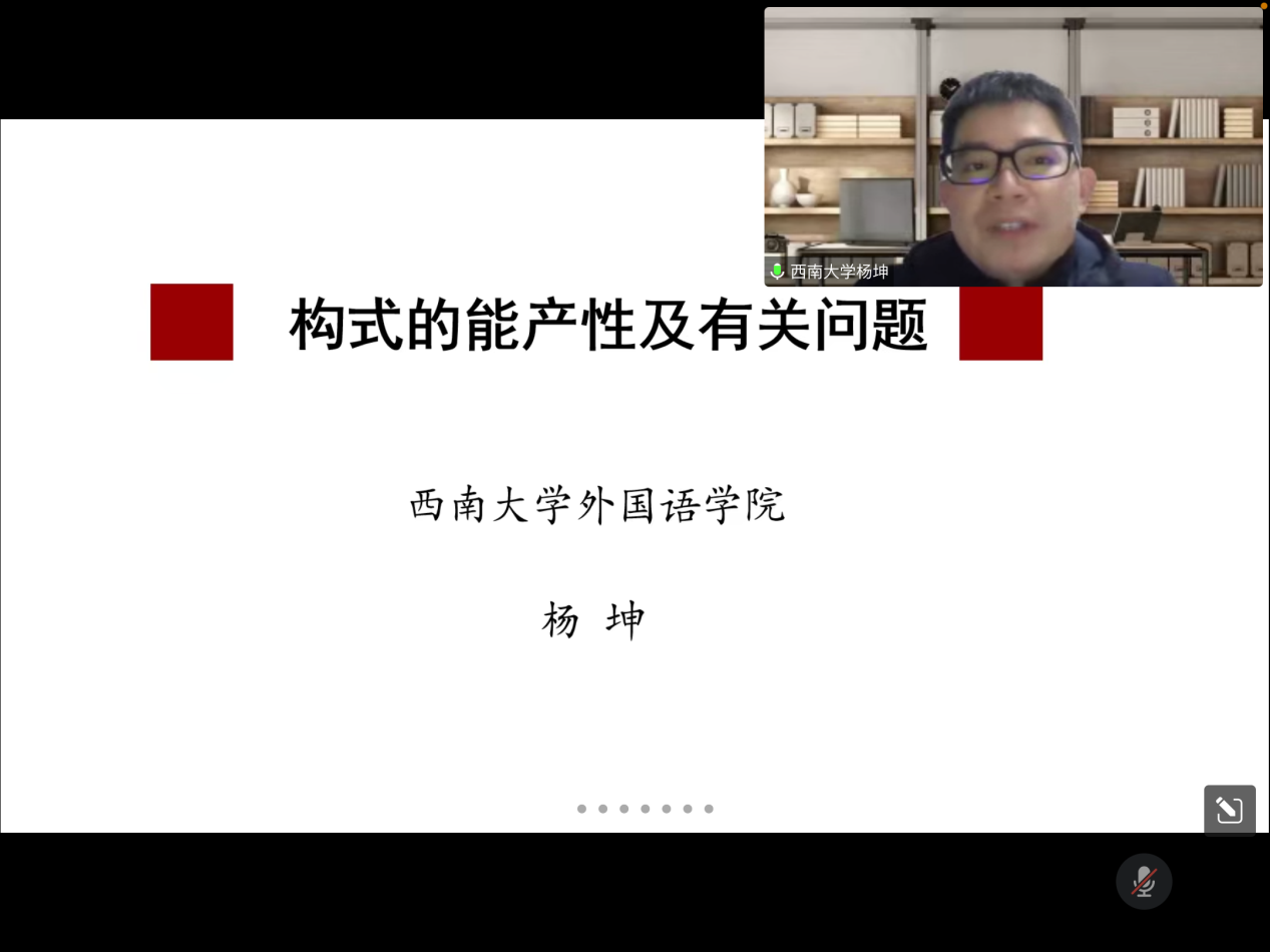 2022年12月13日晚,西南大学外国语学院杨坤教授应邀为XK星空第十八届博力学术论坛 “翻译生态与生态翻译”专题论坛做了题为“构式能产性及有关问题”的讲座。外国语学院部分导师及全体研究生参加了本次讲座。