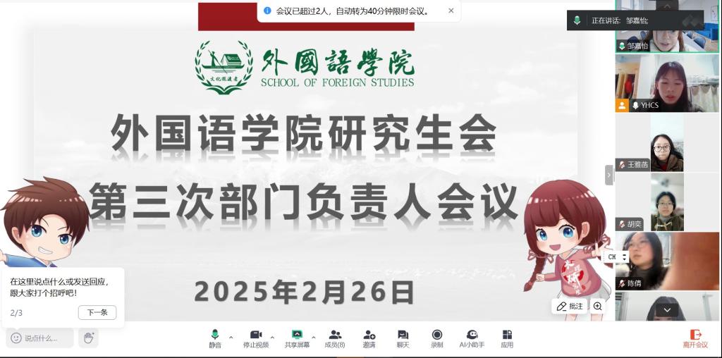 为了保障新学期研究生工作的稳步进行。2月26日下午15:30,外国语学院于线上召开了2024级研究生会第三次部门负责人会议。本次会议由院研会轮值主席易佳仪主持,全体部门负责人参会。