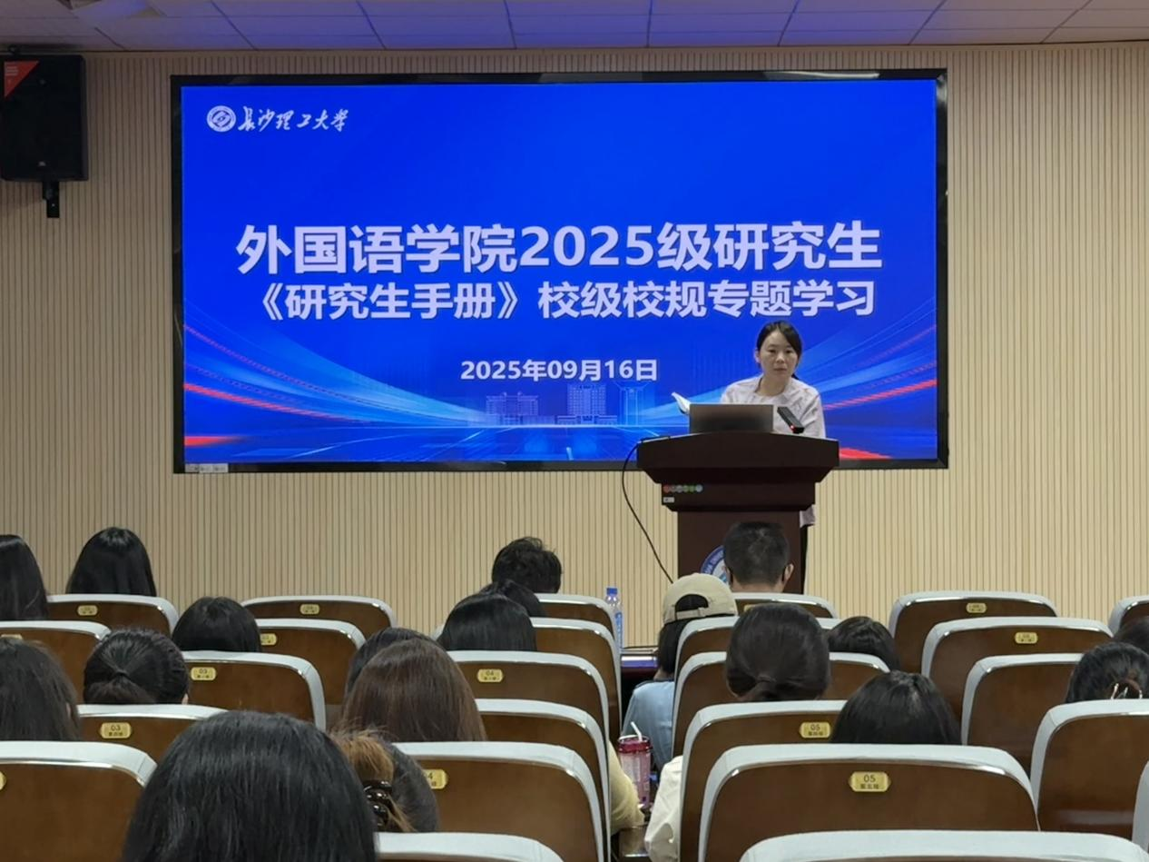 为帮助新生尽快熟悉校园规章制度,筑牢纪律意识,外国语学院于9月16日上午10:30在三教321报告厅开展了2025级研究生《研究生手册》校级校规专题学习讲座。研究生辅导员武巧琳主讲,2025级全体研究生共同参会。