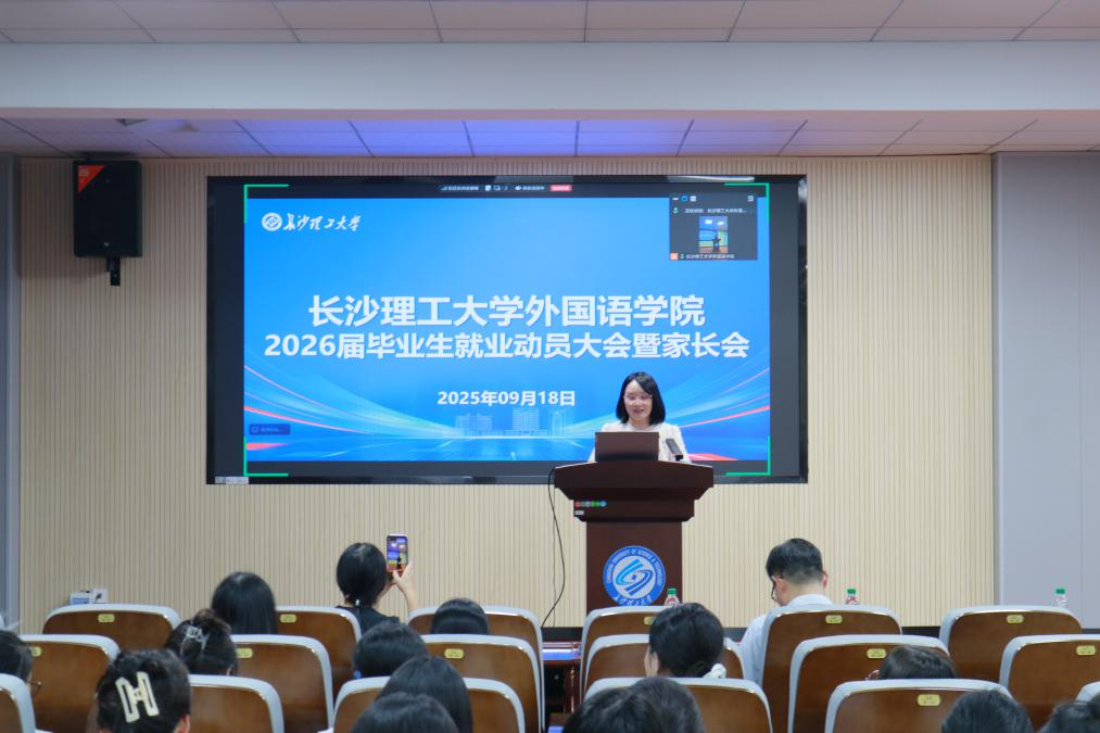 为更好地帮助毕业生把握就业形势,积极应对就业挑战,外国语学院于9月18日下午19:00在3教321报告厅召开了2026届毕业生就业动员大会暨毕业生家长会。学院党委书记陈仁凯主持,院长段胜峰、学院党委副书记周芳以及就业专干武巧琳出席,全体2026届本科和硕士毕业生参会,毕业生家长于线上观看视频直播。