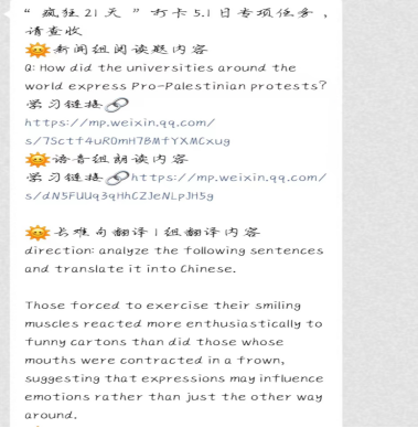 本次打卡活动分为考研和考级两个赛道,同学们依情况选择合适赛道进行打卡。在打卡活动开始之初,参与人员自行选择加入新闻阅读组、语音组或长难句翻译组。自4月20日起同学们在规定时间内在微信打卡小程序上提交每日的单词学习记录以及对应的学习任务。每日打卡结束后,各组负责的专业老师就同学们的打卡内容提出意见与建议,帮助同学们改正和提高。
