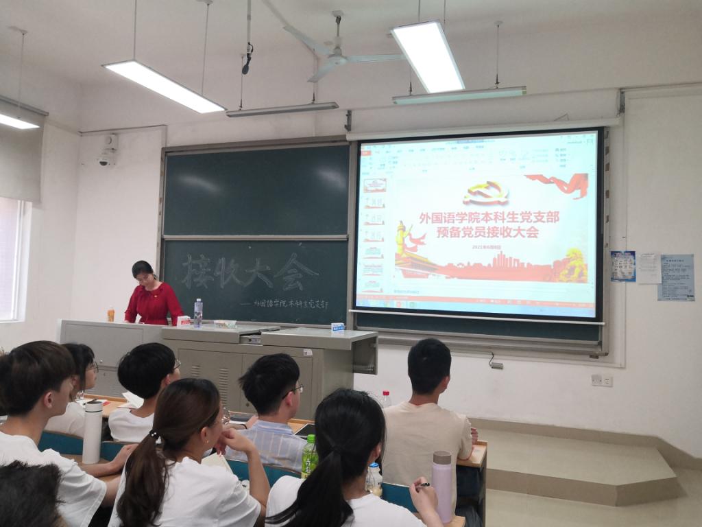 2021年6月8日下午五点,外国语学院本科生党支部于文科楼A207举行预备党员接收大会。本次大会由本科生党支部书记左婷同志主持,外国语学院本科生党支部全体成员及36名拟接收发展对象参加。