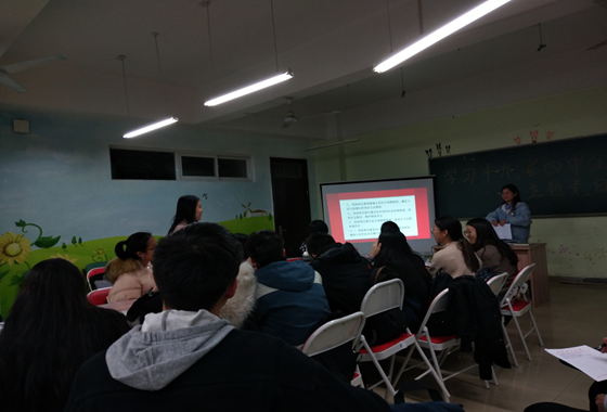 2019年11月25日晚七点,外国语学院本科生党支部在文科楼A503举行了学习党的十九届四中全会主题党日活动。外国语学院本科生党支部全体党员及五名党员发展对象参与此次活动。